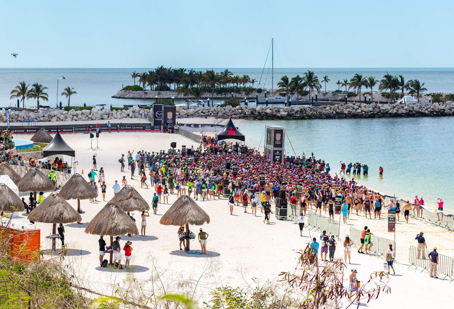 The pros were roped off from the rest of the start corrals, which meant we got to avoid the worst of the pre-race crowding. They announced us one by one as we crossed under the starting arch and lined up on the beach.