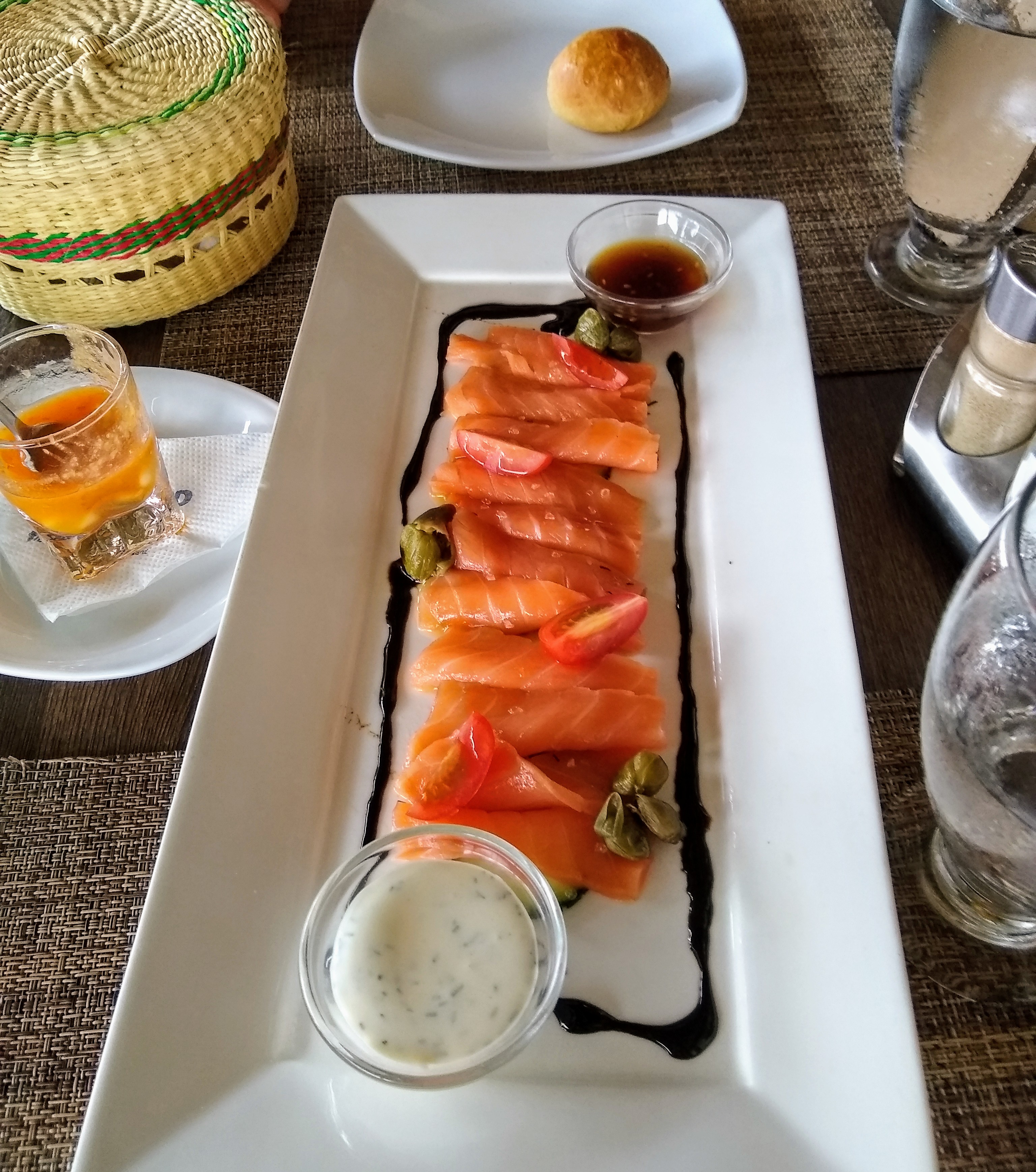 I thought I ordered two full salmon entrees, both cooked medium well... instead we got a sashimi appetizer. (And yes, I know salmon is not local to Ecuador, but it's a pre-race tradition)