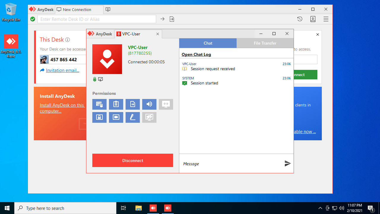 Either side can terminate the session by closing the AnyDesk window.