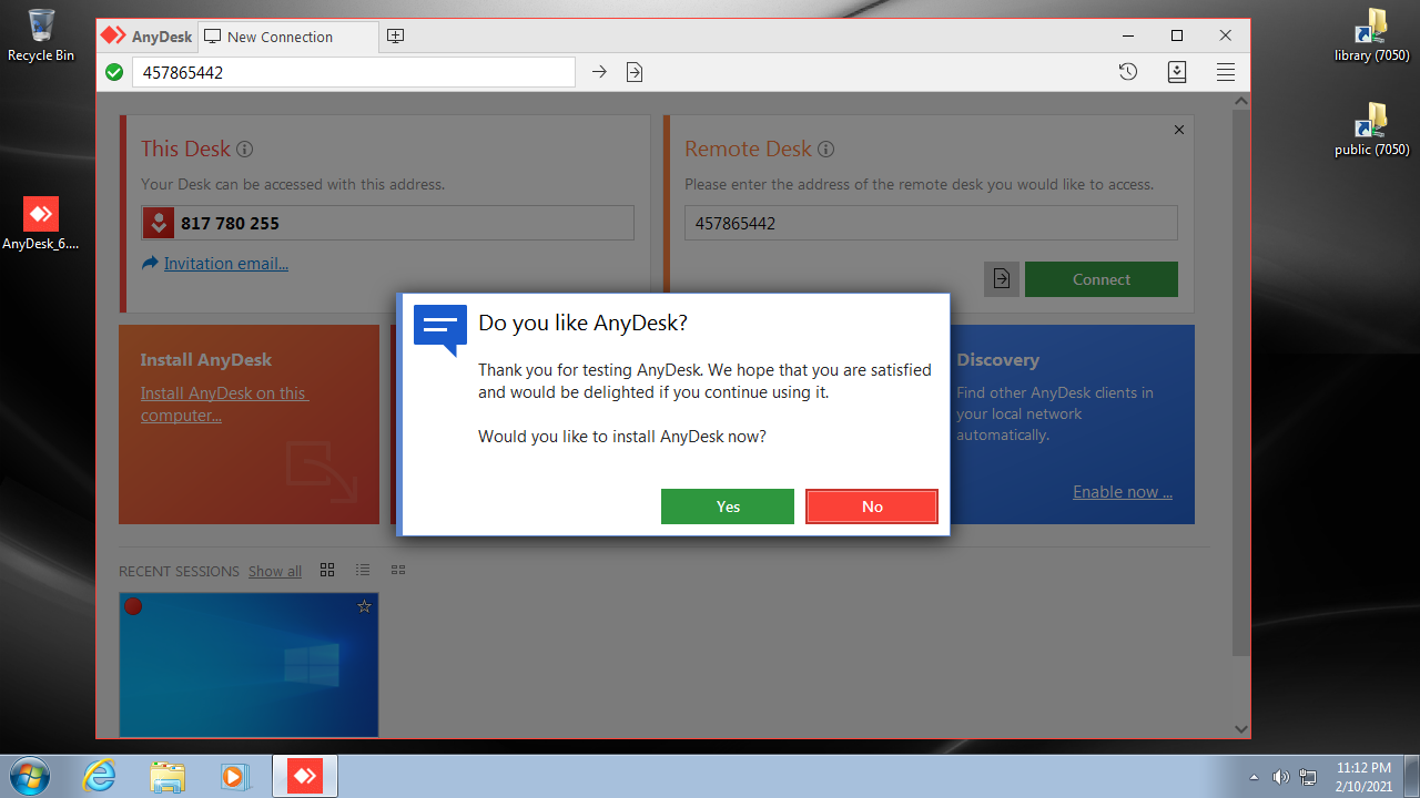 A popup will offer to install AnyDesk. Click "No" if you plan to continue using AnyDesk as a portable app in the future.