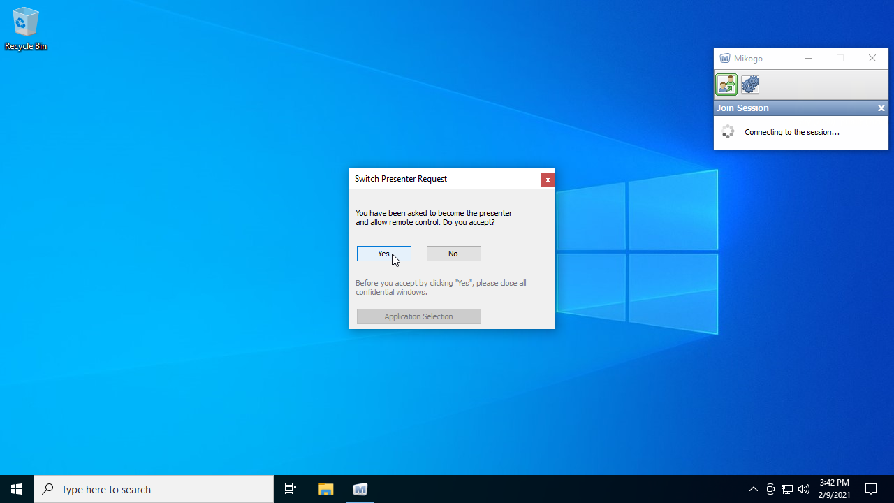 Mikogo will warn Client that she will be permitting remote control of her computer.