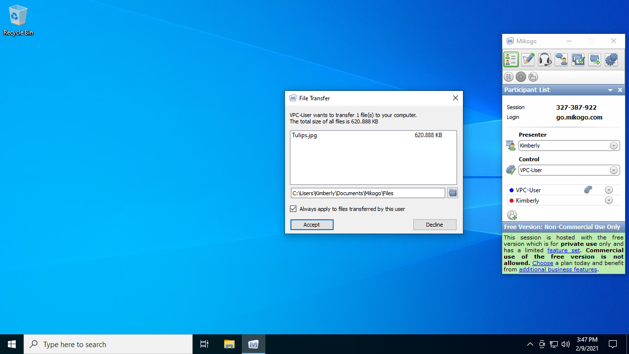 By default, files are downloaded to the Client's "Documents/Mikogo/Files" folder, but can be moved.
