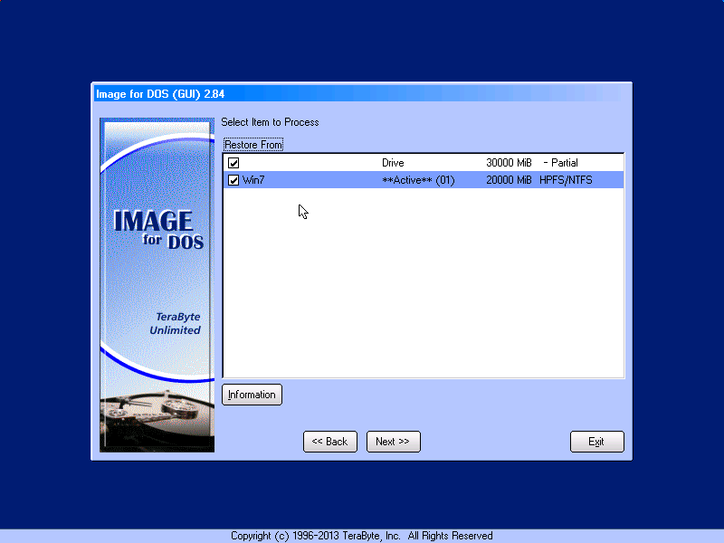 In this illustration, the Image for DOS utility bundled within the BootIt boot manager will be used to restore the system's OS partition. The image is stored on a secondary hard disk, and contains a backup of only the OS partition with no additional partitions.